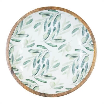 Op zoek naar een stijlvolle schaal om (zomerse) salades of andere gerechten te serveren? Dit exemplaar van By Room is er één voor op uw wensenlijst! Het item is vervaardigd uit mangohout en heeft een rond design met een diameter van 38 cm. De binnenkant is voorzien van een sticker met olive print voor een speels effect. Combineer de schaal met het bijpassende slacouvert voor een elegant geheel.