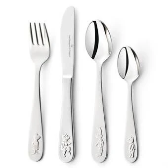 Met het Van Kempen & Begeer Junior kinderbestek eten ook de jongste eters met plezier mee. De bestekdelen zijn voorzien van vrolijke afbeeldingen. Het bestek is vervaardigd uit hoogwaardig roestvrij staal dat goed bestand is tegen voedselzuren. Het formaat van onderdelen van het bestek zijn goed afgestemd op de kinderhand en -mond. Het mes heeft een afgeronde bovenzijde waarmee niet ‘gestoken’ kan worden. Tevens is het mes botter waardoor het veiliger is in gebruik door kinderen.